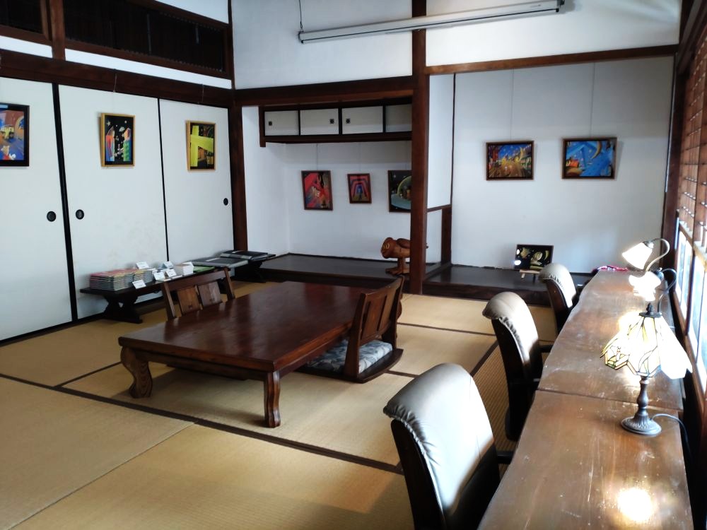 太い梁、畳敷きと襖のある100年昔の空間の中に、未来のような懐かしいようなリベットの絵、皆さんどのように感じていただけたでしょうか。5月10日まで日曜日にオープンします。読み聞かせの会も企画されているそうです。