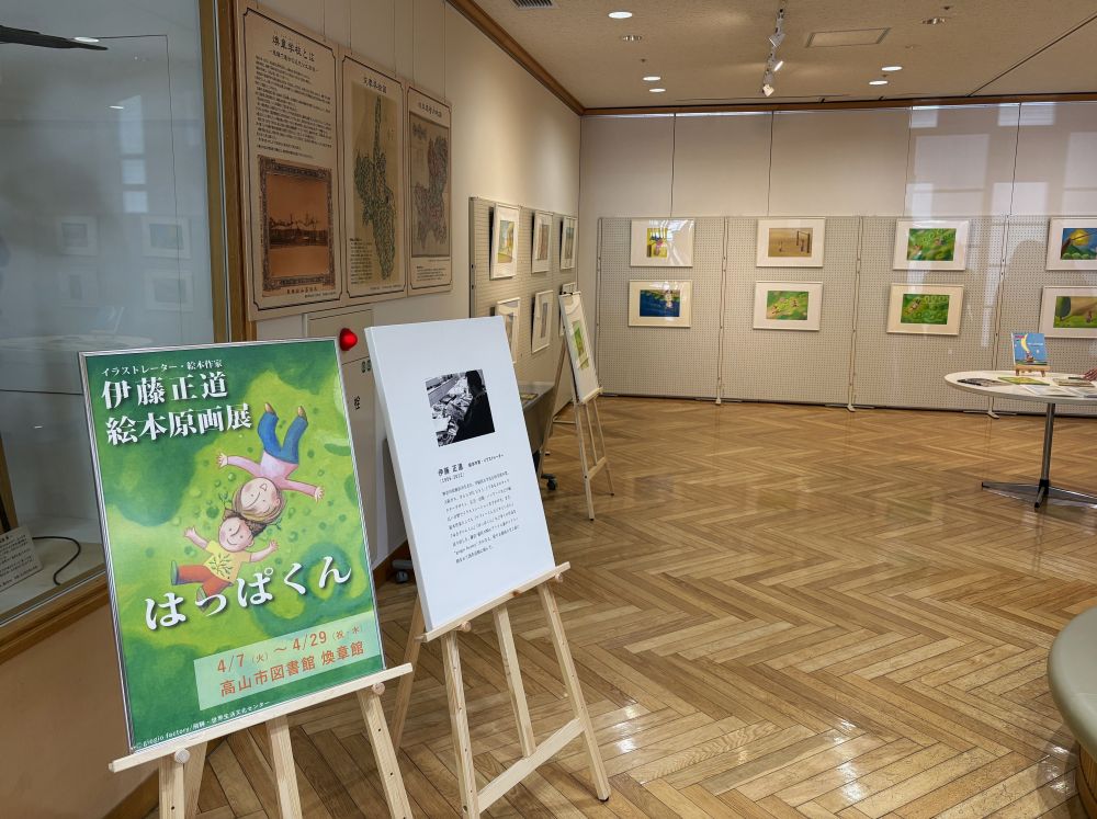 今年も高山市図書館で伊藤正道絵本原画展が開かれています。今回は絵本『はっぱくん』の絵を中心に、他の絵本も紹介されています。